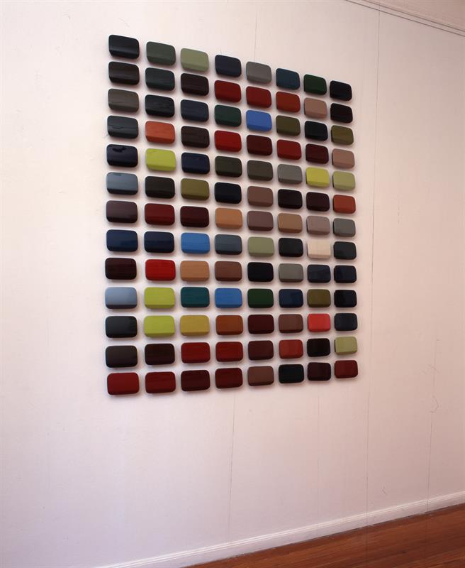 Eπίτοιχη εγκατάσταση Επιχρωματισμένα καπάκια από ντεπόζιτα αυτοκινήτων -Petrarch 188,9 x 154,1 εκ. -Laura 174,1 x 154,1 εκ. Δωρεά Λεωνίδα Ιωάννου, 2018 Αρ. Εισ. 1203/18