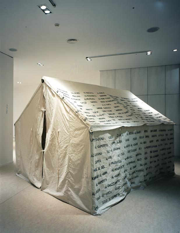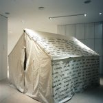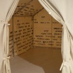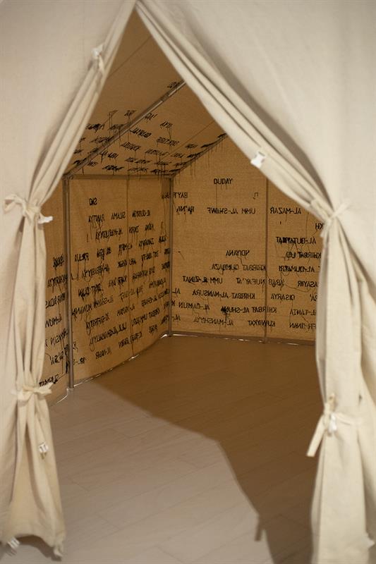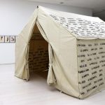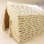 A work in progress consisting of a refugee tent and embroidery thread, mixed media and a record book