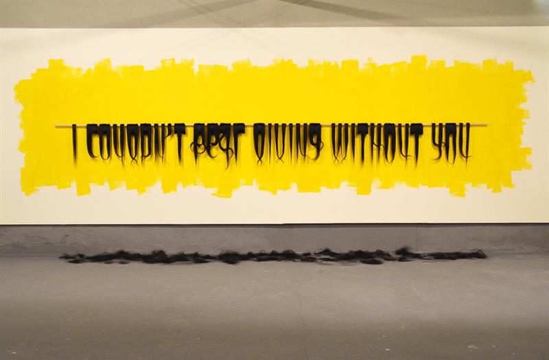 Natural human hair, wooden poles, acrylic paint