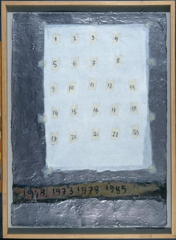 Σφυρήλατο μεταλλικό χρώμα, κολάζ με ψιλό χαρτί, κολλητικές ταινίες, ύφασμα και σχέδια με κάρβουνο σε χαρτόνι 75,5 x 52,5 εκ. Δωρεά του καλλιτέχνη, 2002 Aρ. Εισ. 253/02